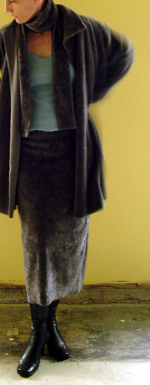 Tribulation: Ensemble for a Hearing in the New McCarthyismTwo-piece suit in an extremely supple and steely grey fake fur gently mocks the clanking fraud of the proceedings. Paired with fitting blue fleece top. Ultra-comfortable and comforting, with matching neck wrap to combat the chill of intolerance and betrayal. Can be worn for days on end and slept in to no bad effect. Heeled, leather boots were made for walking-- and for kicking corrupt, disrespectful, slimemongering and self-serving captains of industry and lawmakers in the butt. (Car coat and street-length slender skirt in low-pile faux fur, matching long scarf, blue moleskin fleece shell) 3 of 14 previous + + next + + restart + + ideal home |